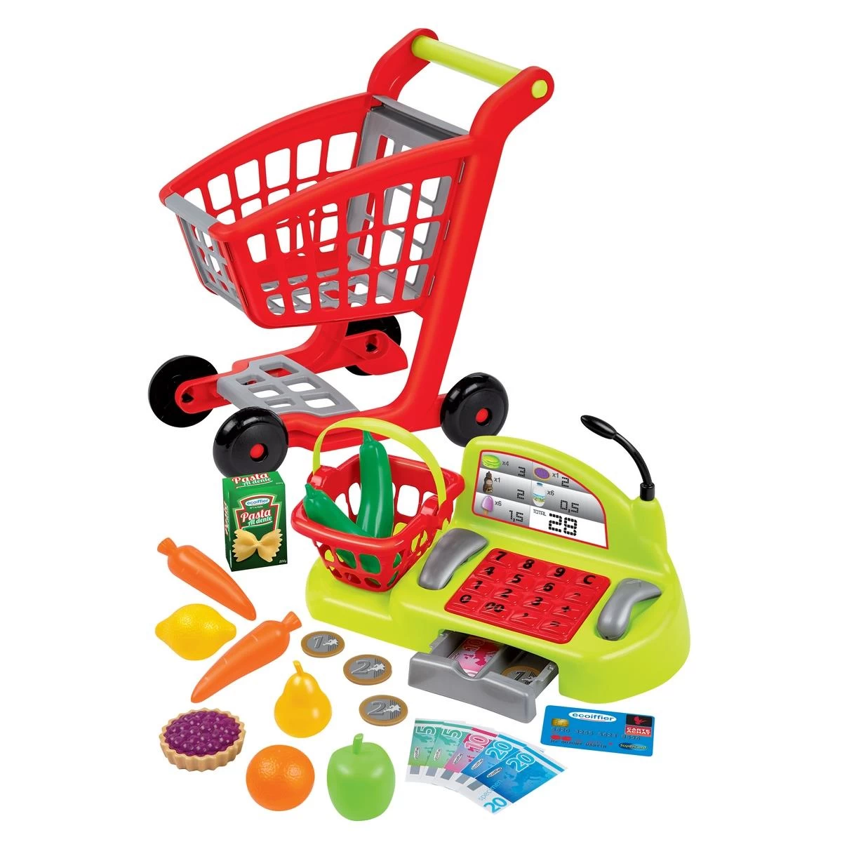 Ecoiffier propose des imitations rĂ©alistes des accessoires servant Ă faire les courses ou Ă tenir un point de vente. Comment mieux dĂ©couvrir le monde du commerce ? Faire des petits calculs ? Improviser des histoires ? C’est en imitant les adultes et en manipulant diffĂ©rents jouets que votre enfant apprend intuitivement Ă devenir plus habile et plus autonome au quotidien. On fait l’inventaire ? Le coffret – Chariot de supermarchĂ© pour enfants, caisse enregistreuse et accessoires comprend : 1 chariot de supermarchĂ© pour enfants dĂ©jĂ rempli, 1 caisse enregistreuse avec ses pièces de monnaie, 1 carte bancaire, 1 lecteur de codes-barres, 1 tĂ©lĂ©phone et 1 micro. Dimensions de l’article : 63 x 29.5 x 41.5 centimètres.Â