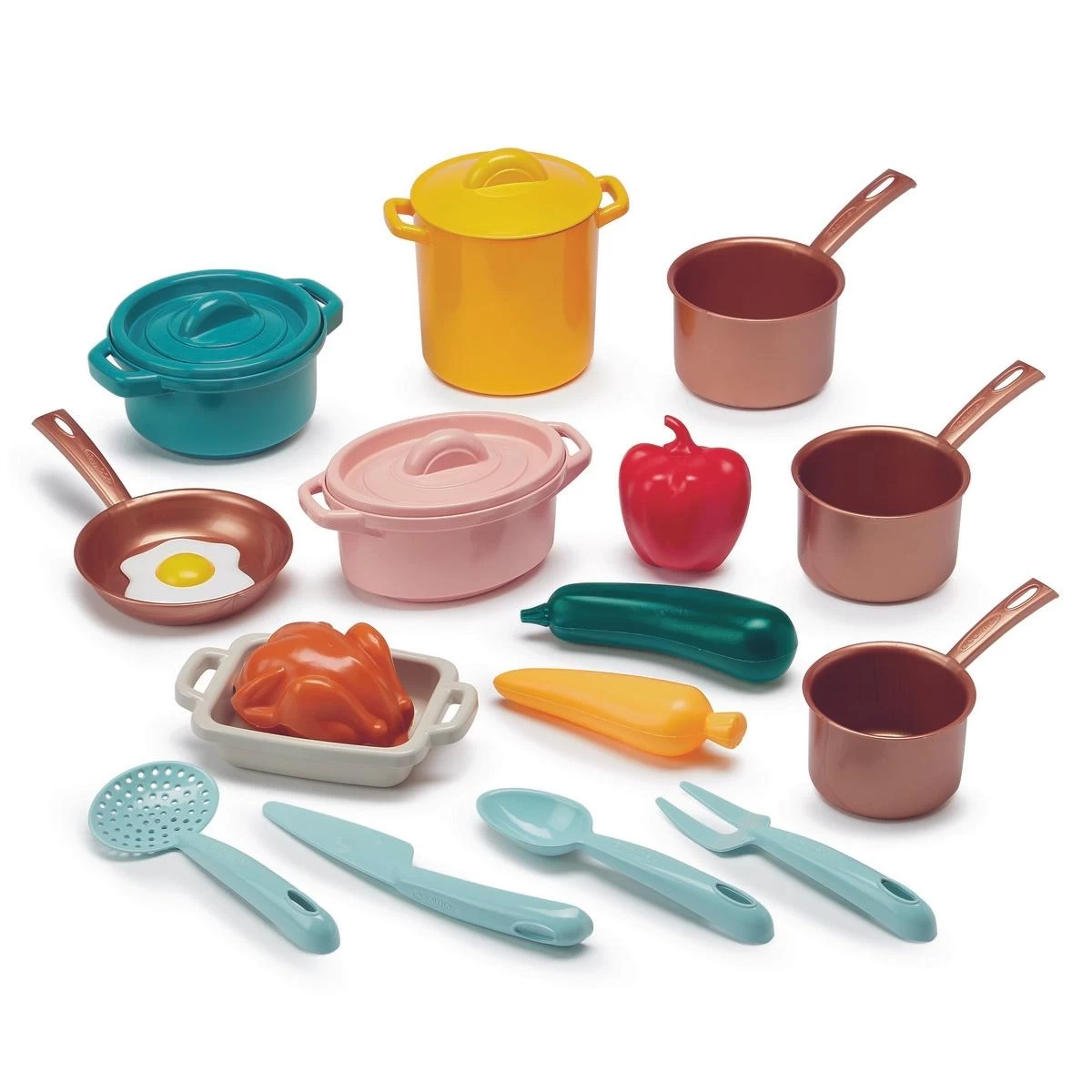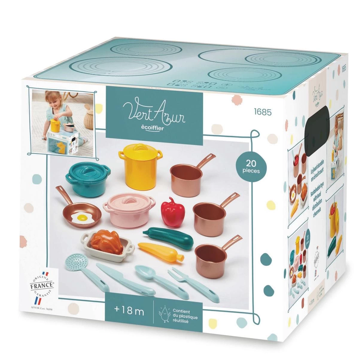 Ce set comprend tout le nécessaire pour cuisiner comme un chef avec 20 ustensiles (casseroles, poêles, poulet, légume, couverts). La boîte elle-même représente une gazinière pour faire comme les grands !